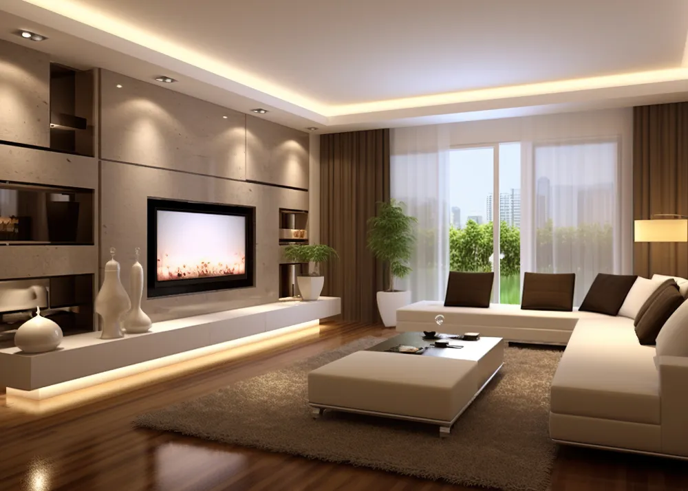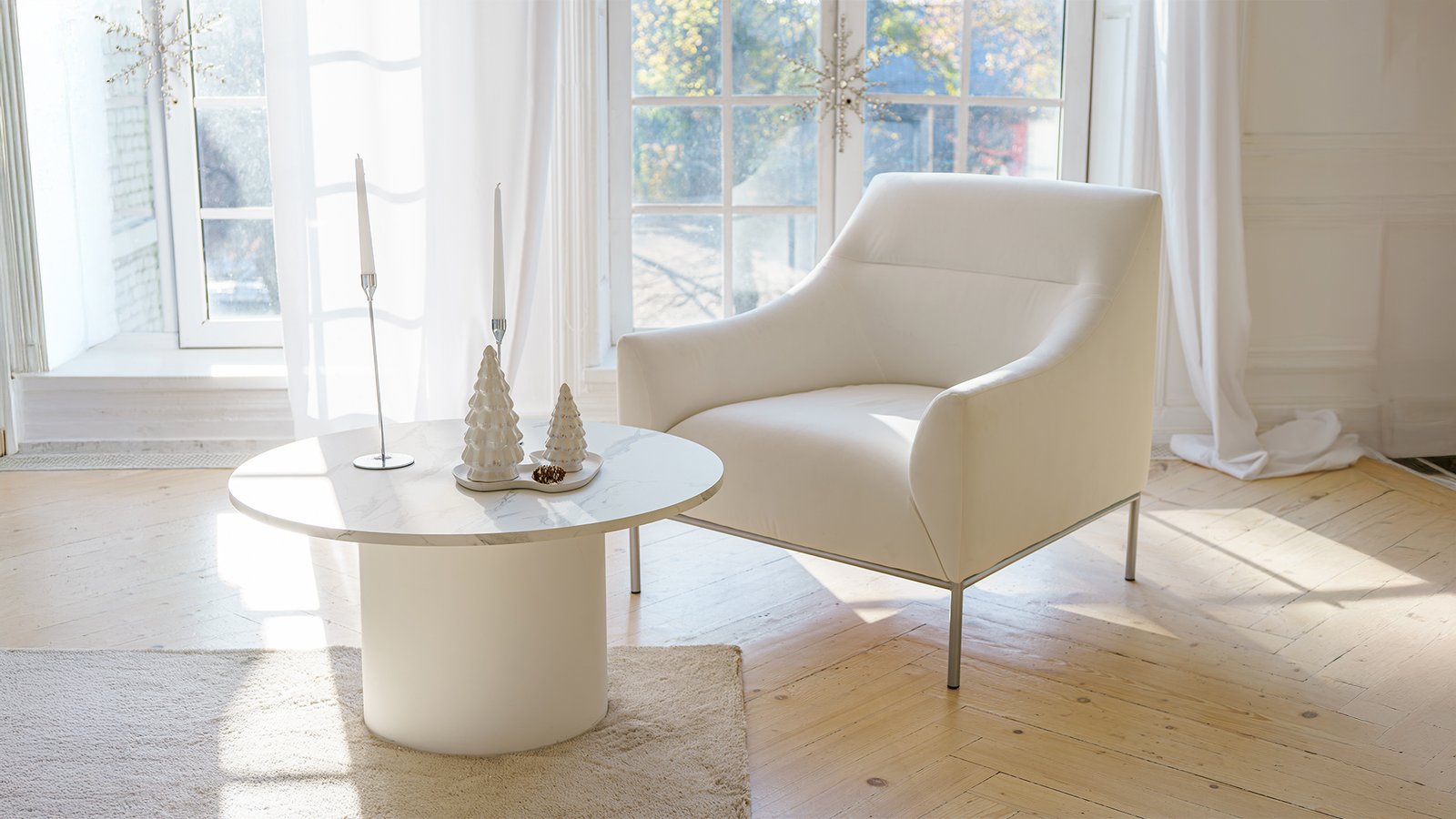 Mesa de centro redonda com tampo de mármore preto e veios dourados, base geométrica em metal bronze, sobre tapete luxuoso.
